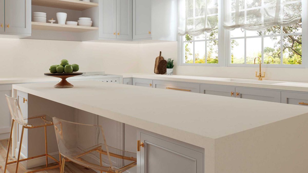 A gentle off-white touched by honied-amber capillaries that flow softly across the surface,with Honed finish for a tinge of freshness that reflects more light in the kitchen.